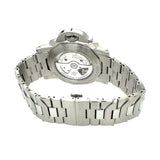 Silver vertical brushed with luminous Arabic numerals and hour markers. Date at 3 o’clock, small seconds at 9 o’clock